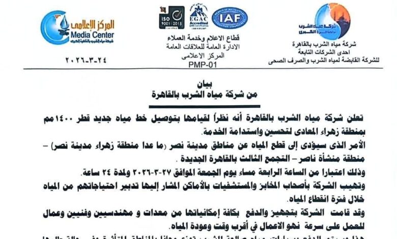 انقطاع المياه في مناطق متعددة بالقاهرة لمدة يوم كامل اعتبارًا من مساء الجمعة 27 مارس