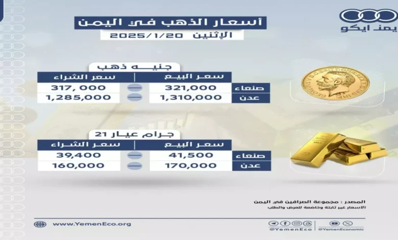وفقا لأحدث البيانات الصادرة اليوم الثلاثاء 20 يناير 2026، سجل سعر جنيه الذهب في أسواق صنعاء 553,000 ريال، بينما وصل ثمن نفس الجنيه في عدن إلى 1,678,000 ريال، أي بما يعادل ثلاثة أضعاف ونصف السعر في الشمال.