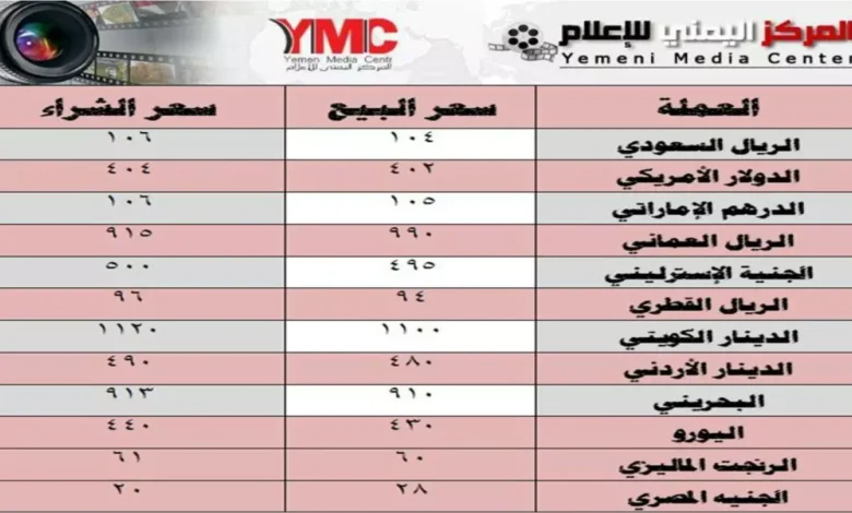 | العملة | سعر الصرف في عدن | سعر الصرف في صنعاء |