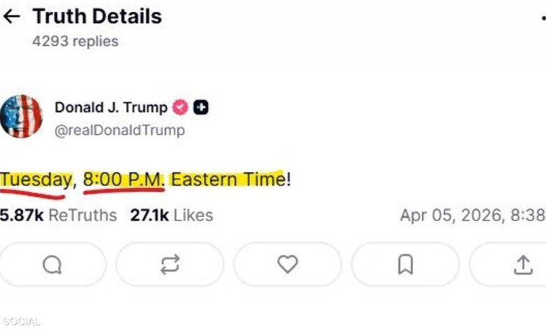 فقد كتب ترامب على منصته يقول “الثلاثاء، الساعة 8:00 مساء، بتوقيت الساحل الشرقي”.