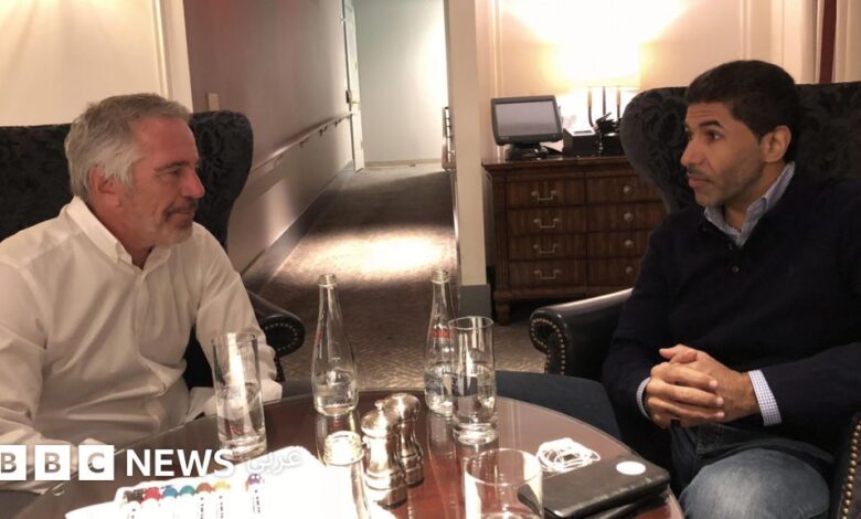التعليق على الصورة، صورة من ملفات إبستين يظهر فيها جبر بن يوسف آل ثاني على اليسار وجيفري إبستين على اليمين