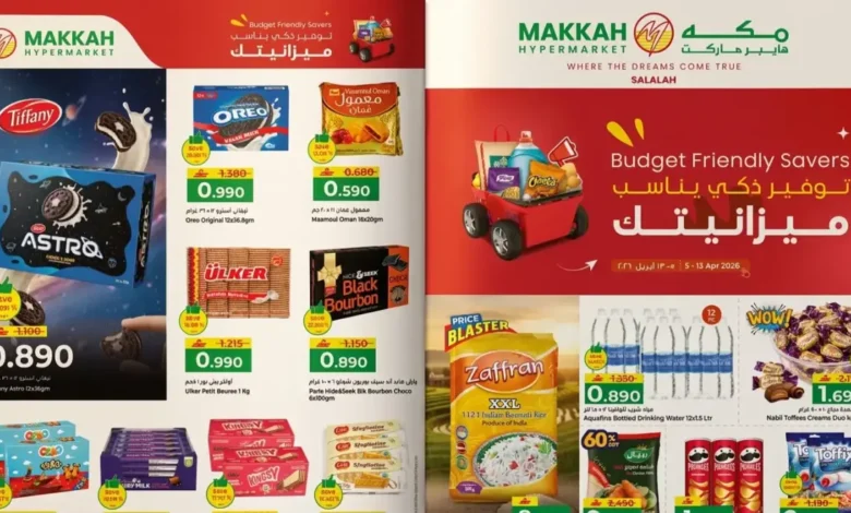 أطلق مكة هايبر ماركت (Makkah Hypermarket) في فرع صلالة وغيرها من الفروع في سلطنة عمان حملة عروض ضخمة تحت شعار “توفير ذكي يناسب ميزانيتك”، هذه الحملة تبدأ في 5 أبريل 2026 وتستمر حتى 13 من نفس الشهر، مع تحذير أن العروض سارية حتى نفاد المخزون، مما يخلق تنافسًا حقيقيًا مع الزمن.